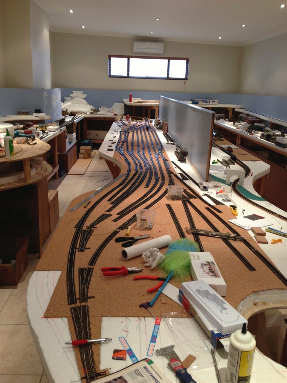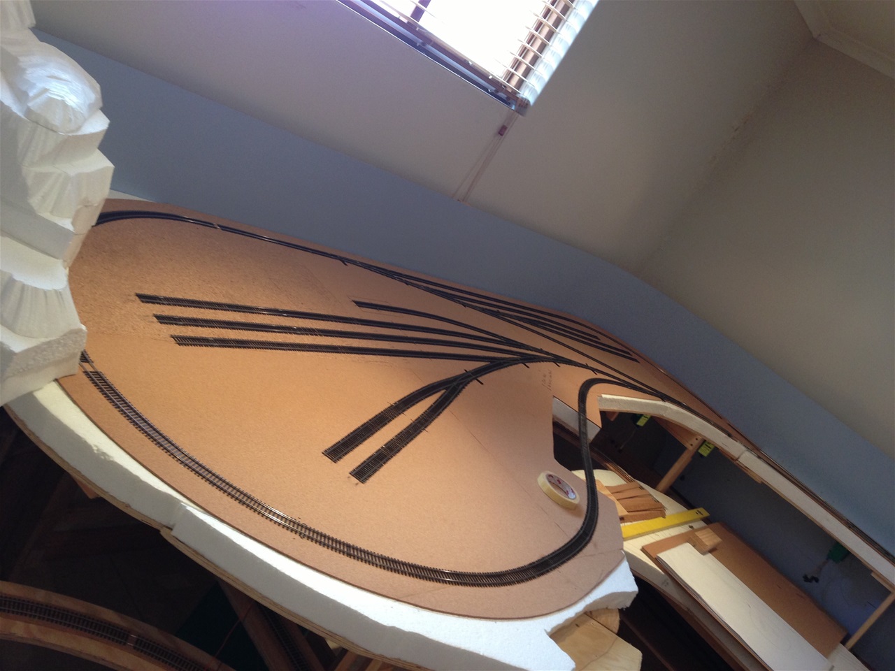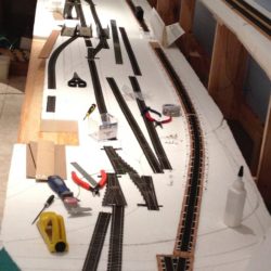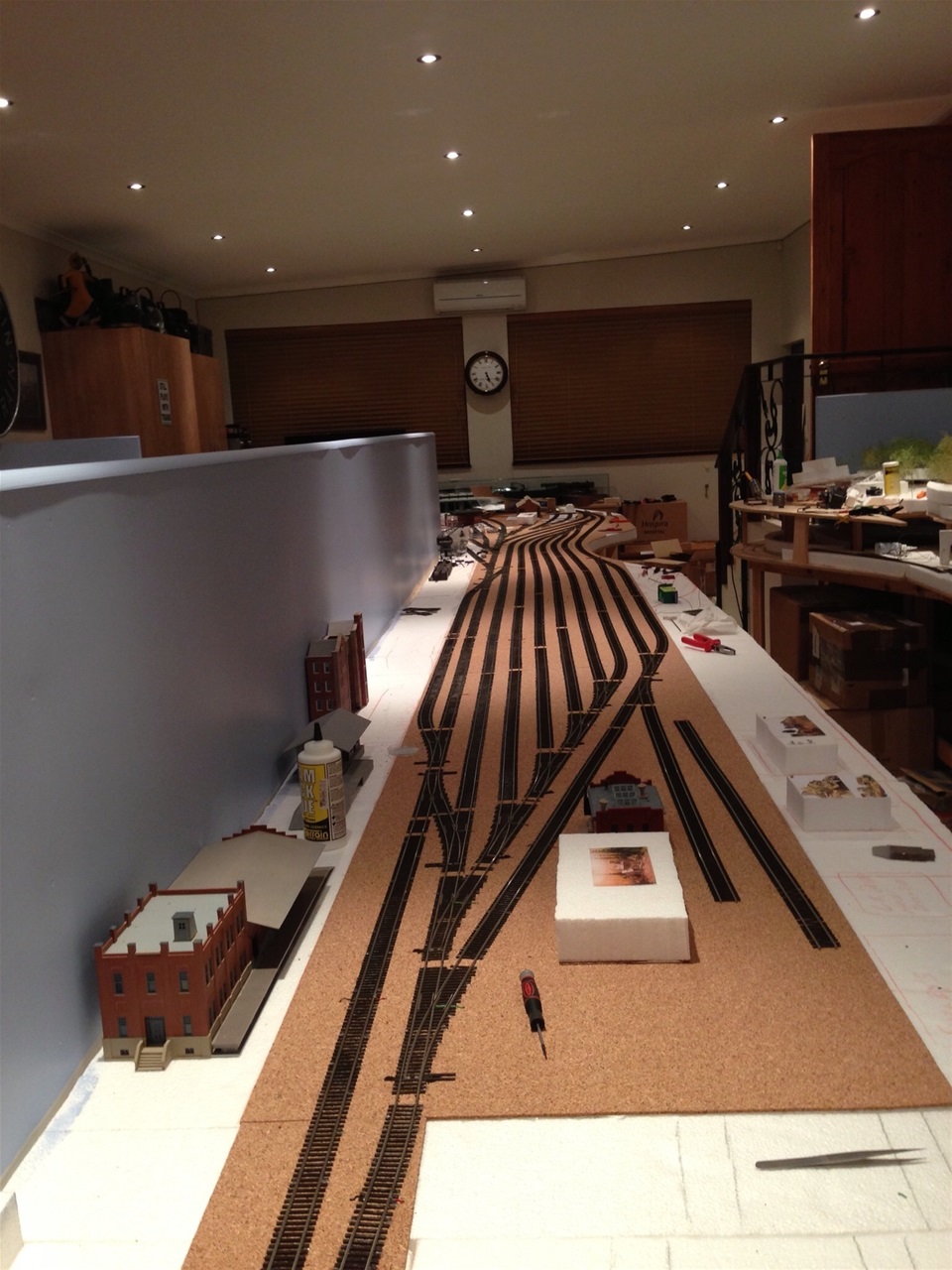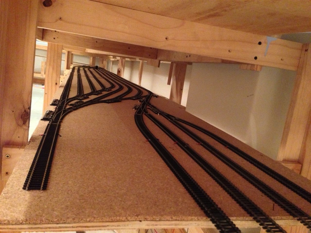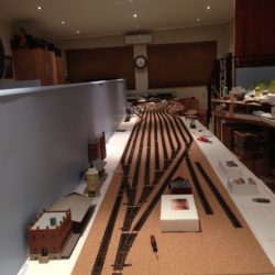 The main line has 5mm cork underlay and the yards and spurs have a 3mm underlay. Every second section of track has feeder wires to the main power bus.