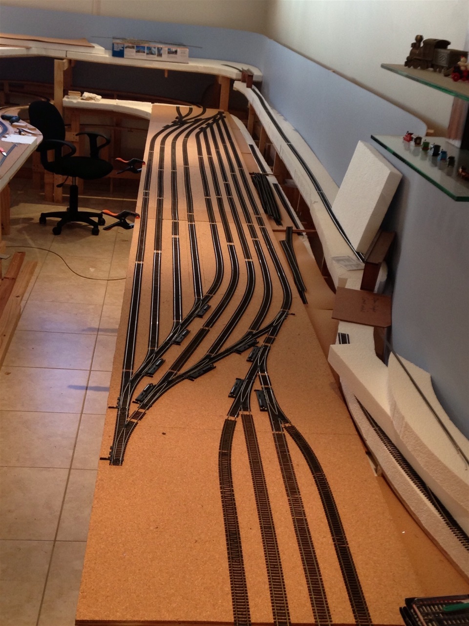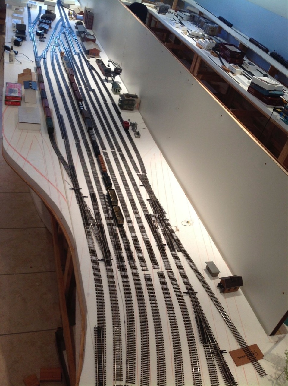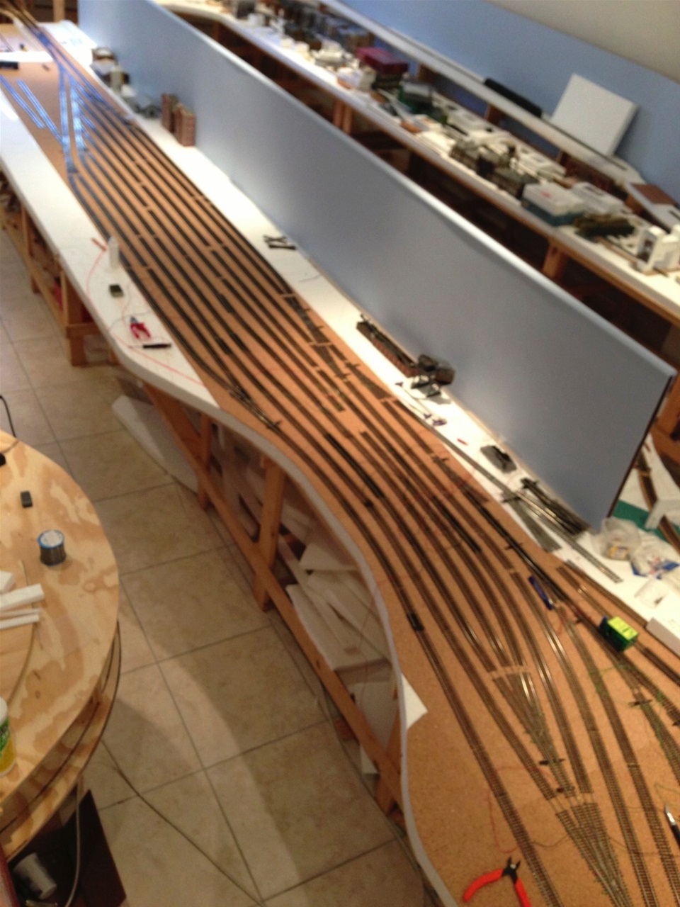 The main line has 5mm cork underlay and the yards and spurs have a 3mm underlay. Every second section of track has feeder wires to the main power bus.
