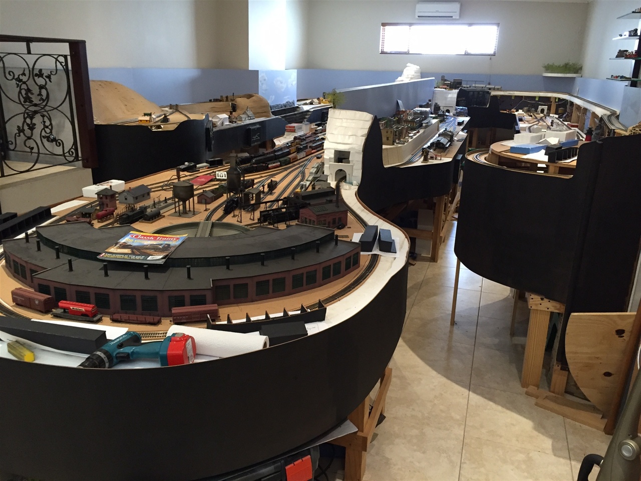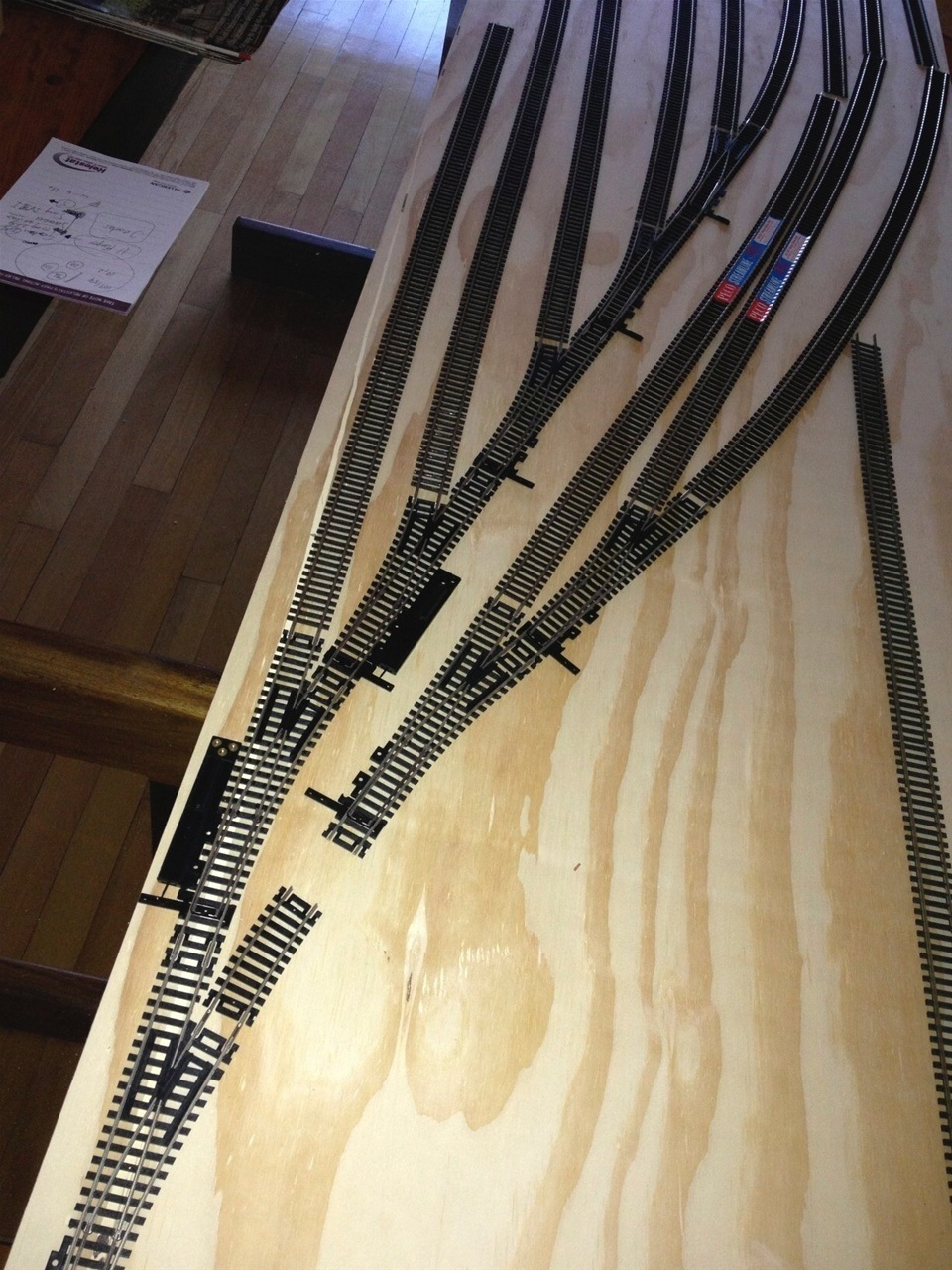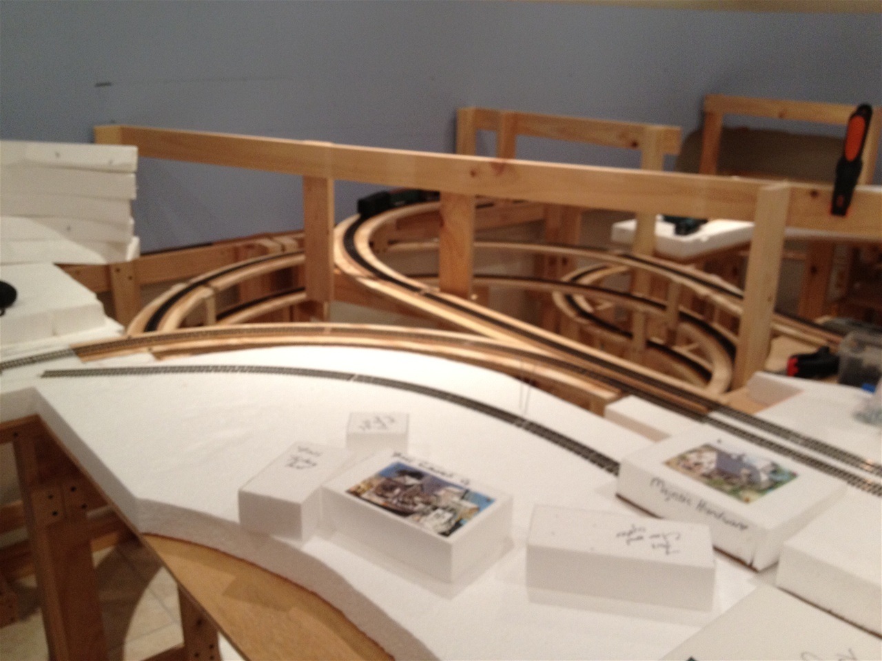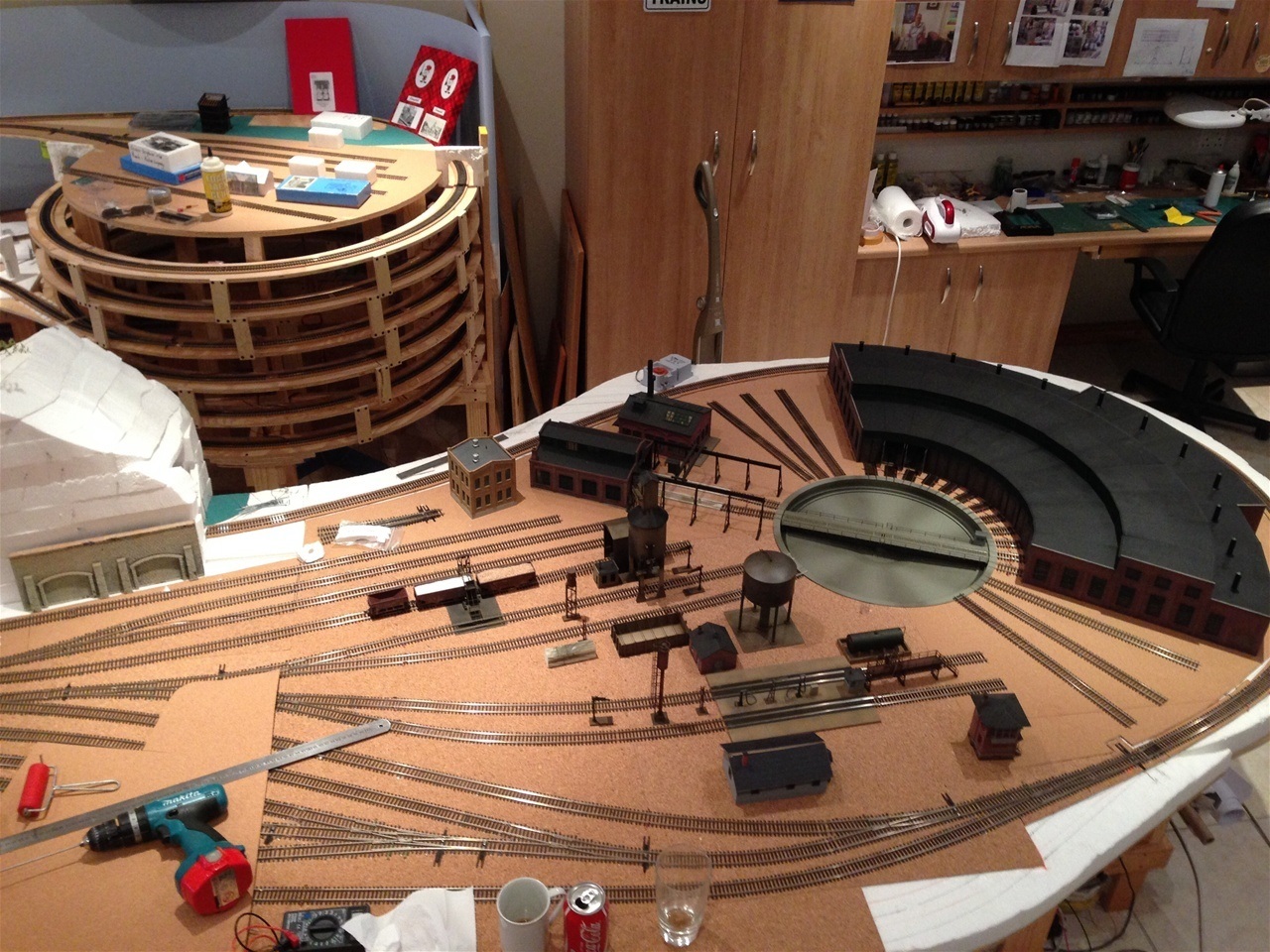 The main line has 5mm cork underlay and the yards and spurs have a 3mm underlay. Every second section of track has feeder wires to the main power bus.