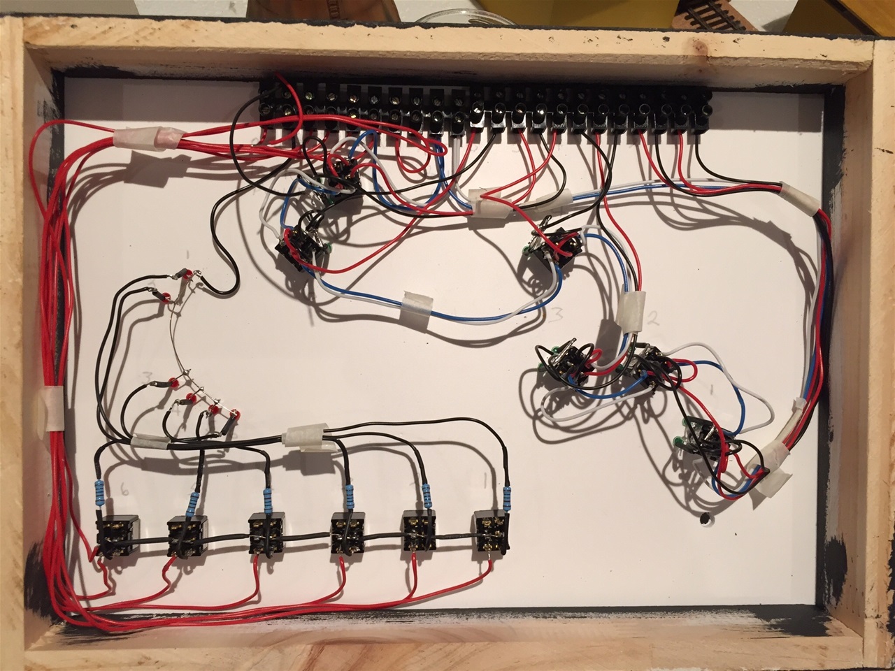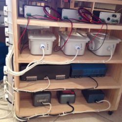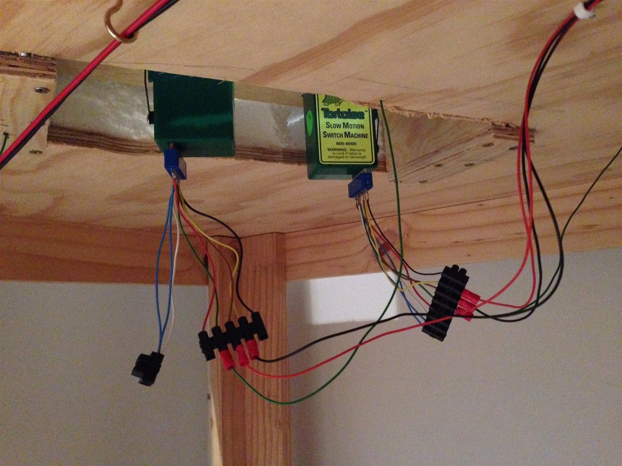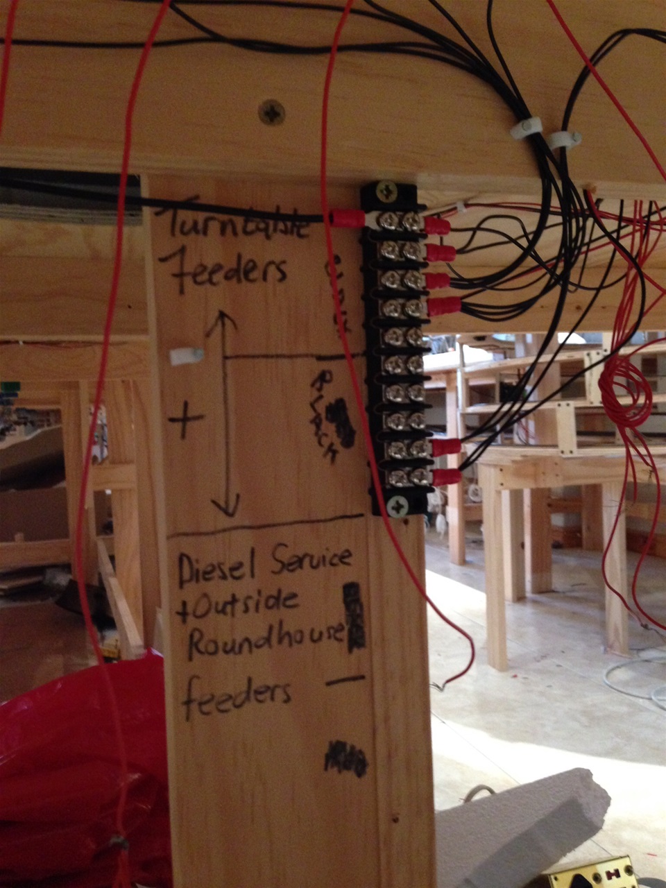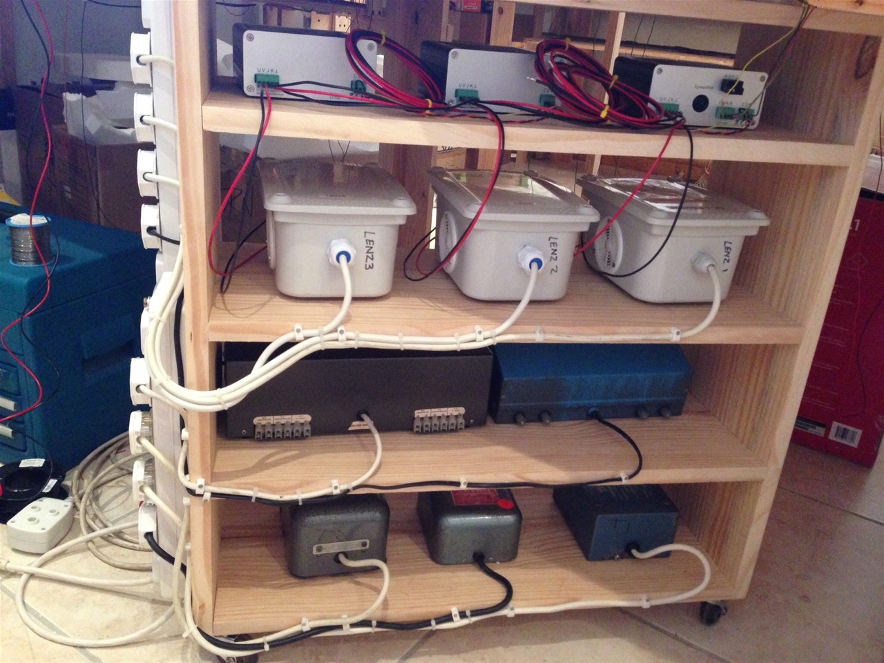 I am using a Lenz DCC system with three power districts on the layout with CVP products wireless throttles. Each district has two circuit breakers. My bus wires are red and black. Power for turnouts use their own bus with blue and white wires. All lights on the layout has their own bus with orange and yellow wires. The Lenz, wireless consoles and all transformers are mounted on a storage rack with lockable castor wheels for easy access. Wiring from the storage rack is in a long loom for easy access.